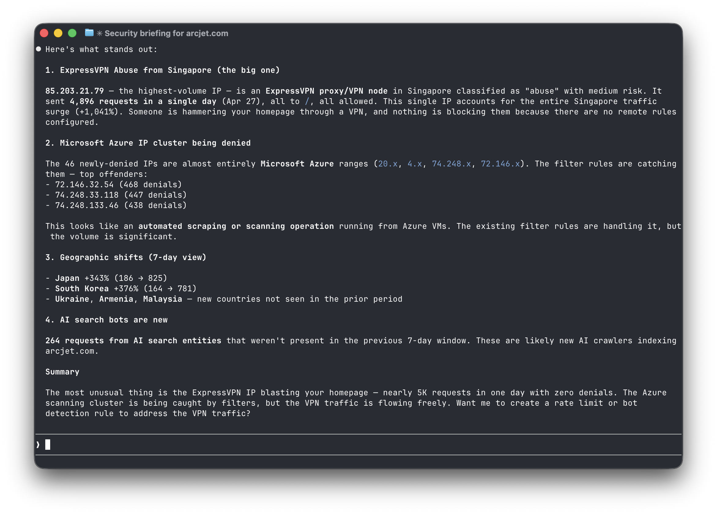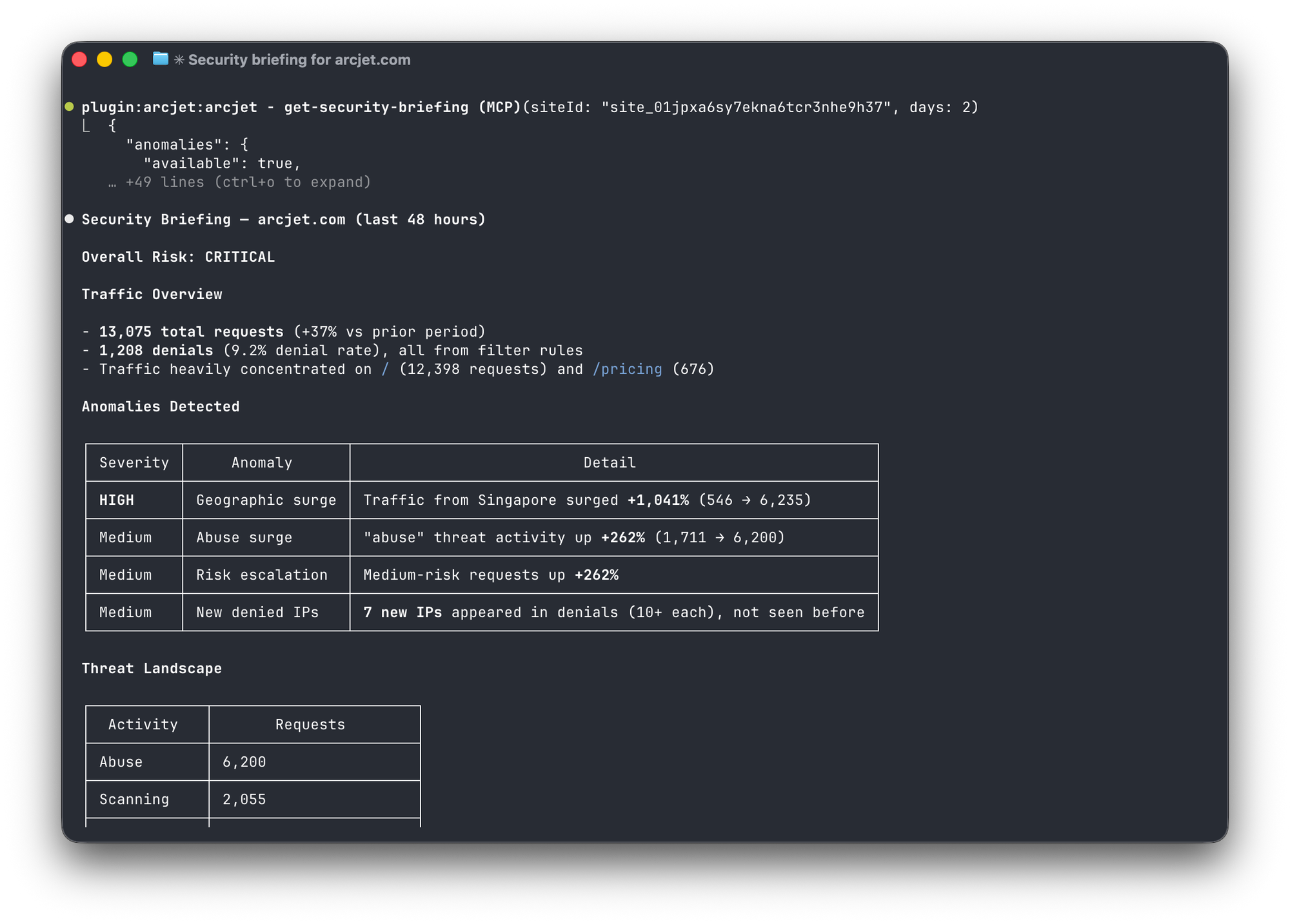 Those are a natural fit for an AI agent, but only if it can reach the right product context. So we built an MCP server for Arcjet with tools for security briefings, traffic analysis, anomaly detection, request investigation, threat intelligence, and dry-run impact analysis.