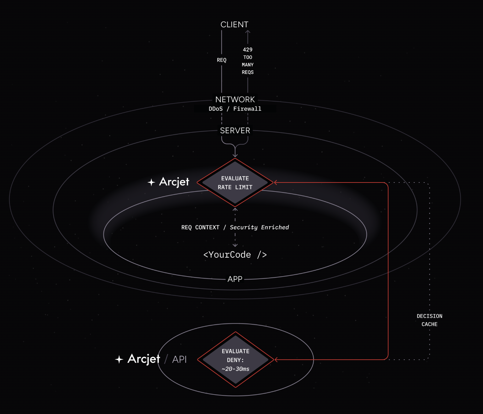 Intercepting every incoming request means Arcjet is the hot path for your application. One of our design principles is that Arcjet should not interfere with the rest of the application. It should be easy to install, must not add significant latency to requests, and should not require changes to the application’s architecture.