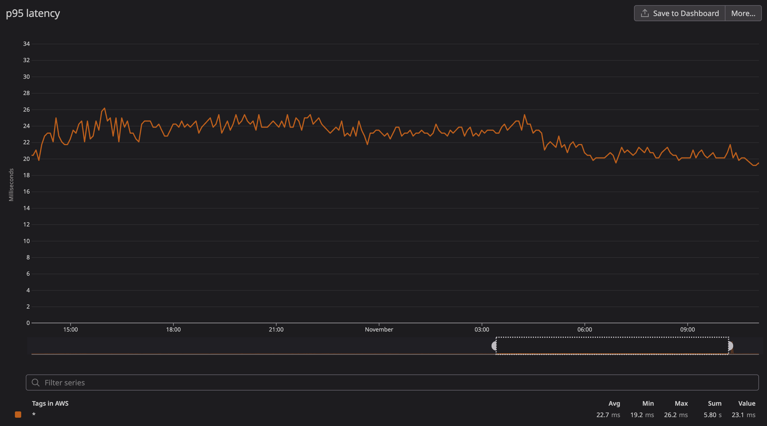 The result is our p95 API response time of around 25ms, which is within our goal range of 20-30ms. Our p50 is around 4ms, but we pay more attention to the outliers revealed by the p95 because those are what cause real user experience degradation.