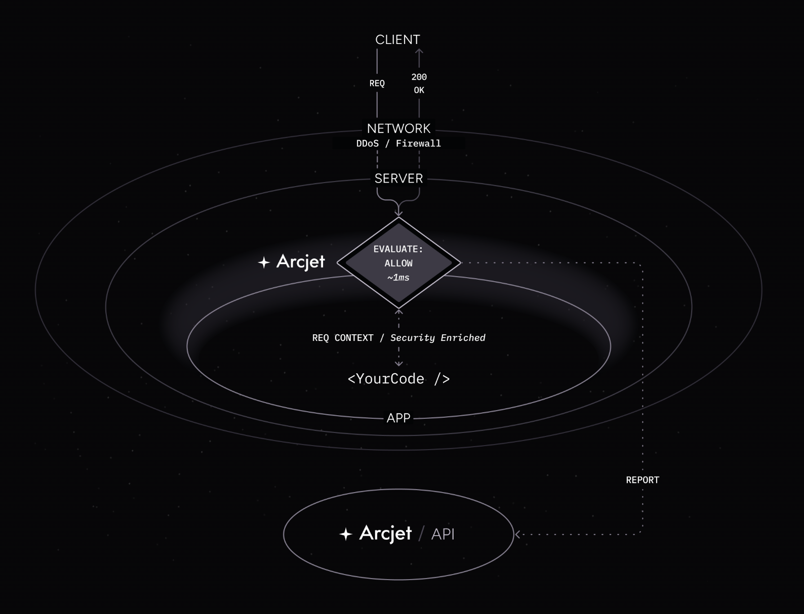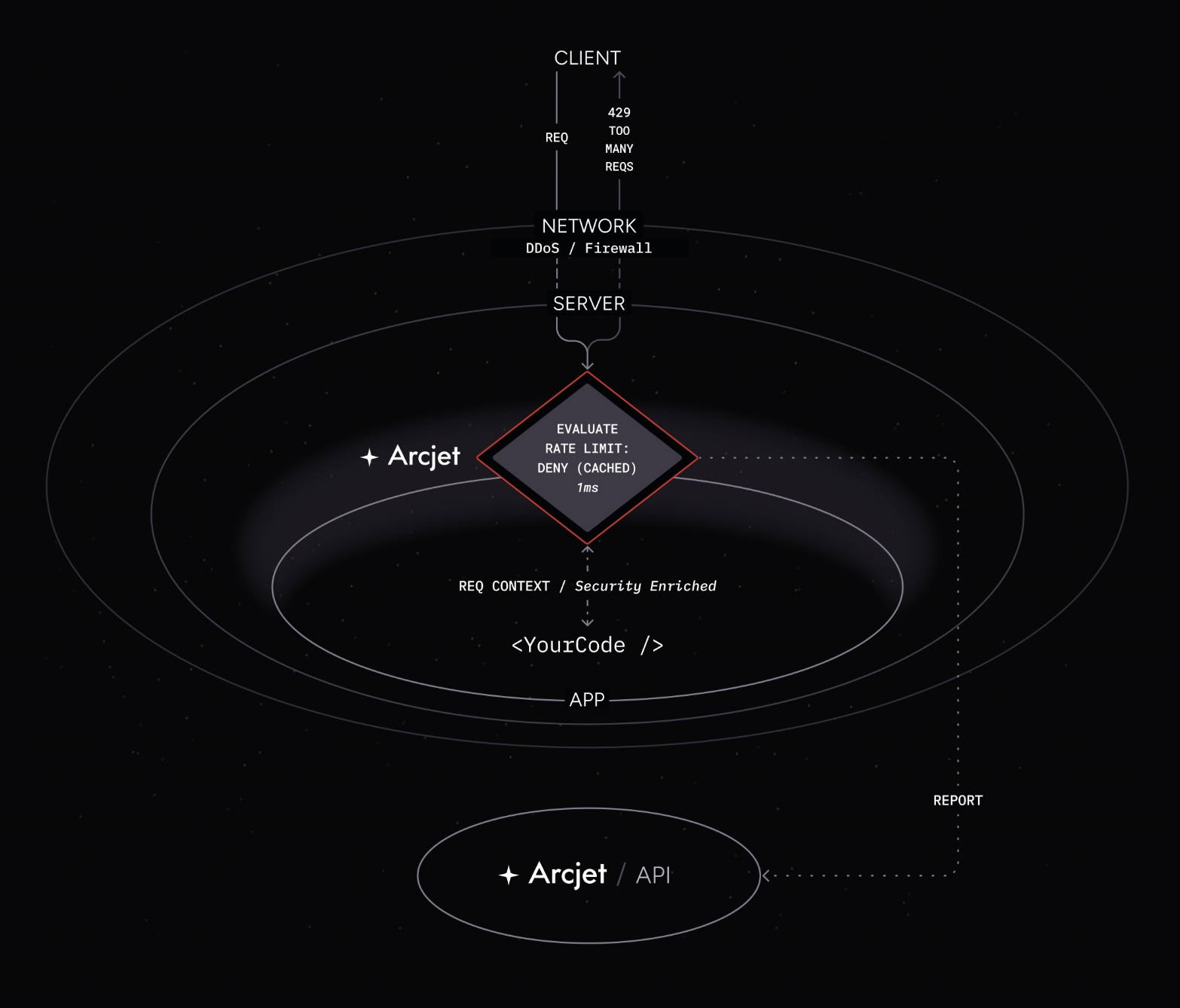 Integrating Arcjet into your application involves installing our SDK. This gives developers an interface for configuring rules, passes the request through for analysis, and then returns the result.