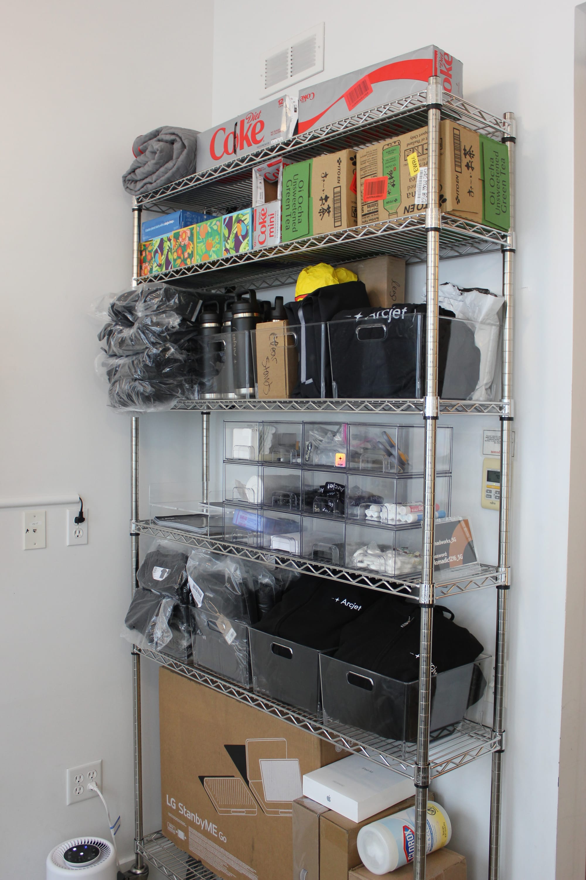 Our space has tall ceilings, so we wanted to use that vertical space wisely. Since we attend a fair number of conferences, we’ve built up quite the collection of marketing materials and team swag. To keep everything tidy, we invested in an industrial ULINE shelf.