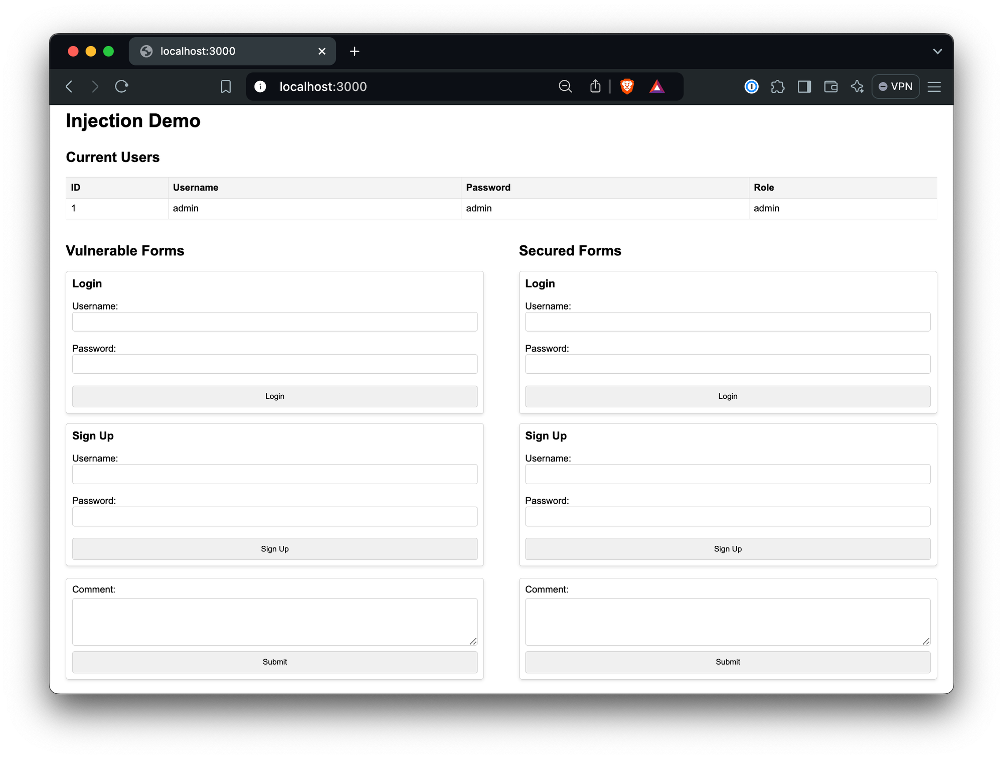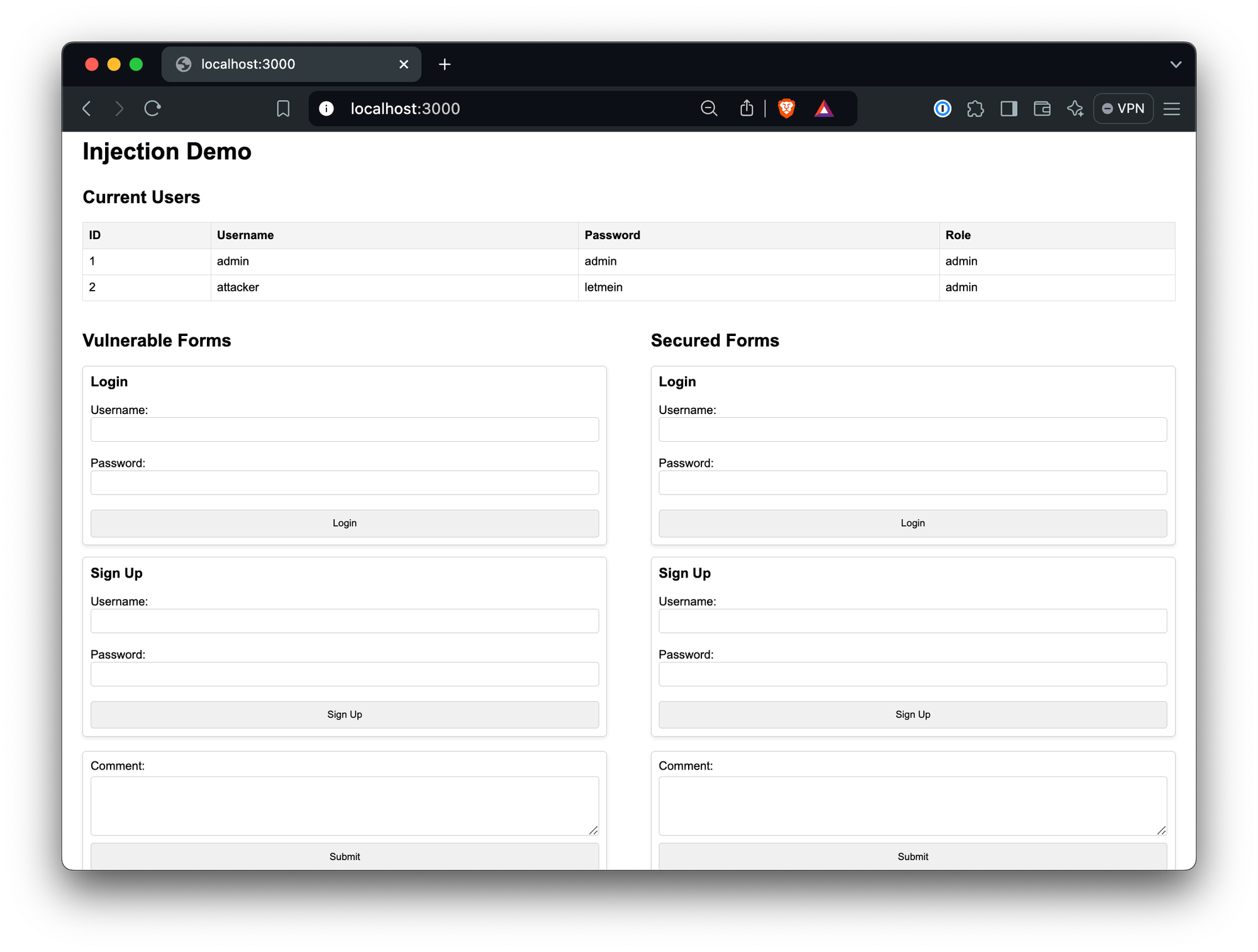 npx tsx src/index.tsYou’ll see the contents of the user table, and a number of forms that allow you to login, signup, and comment, with a choice of hitting the vulnerable or secured endpoints: