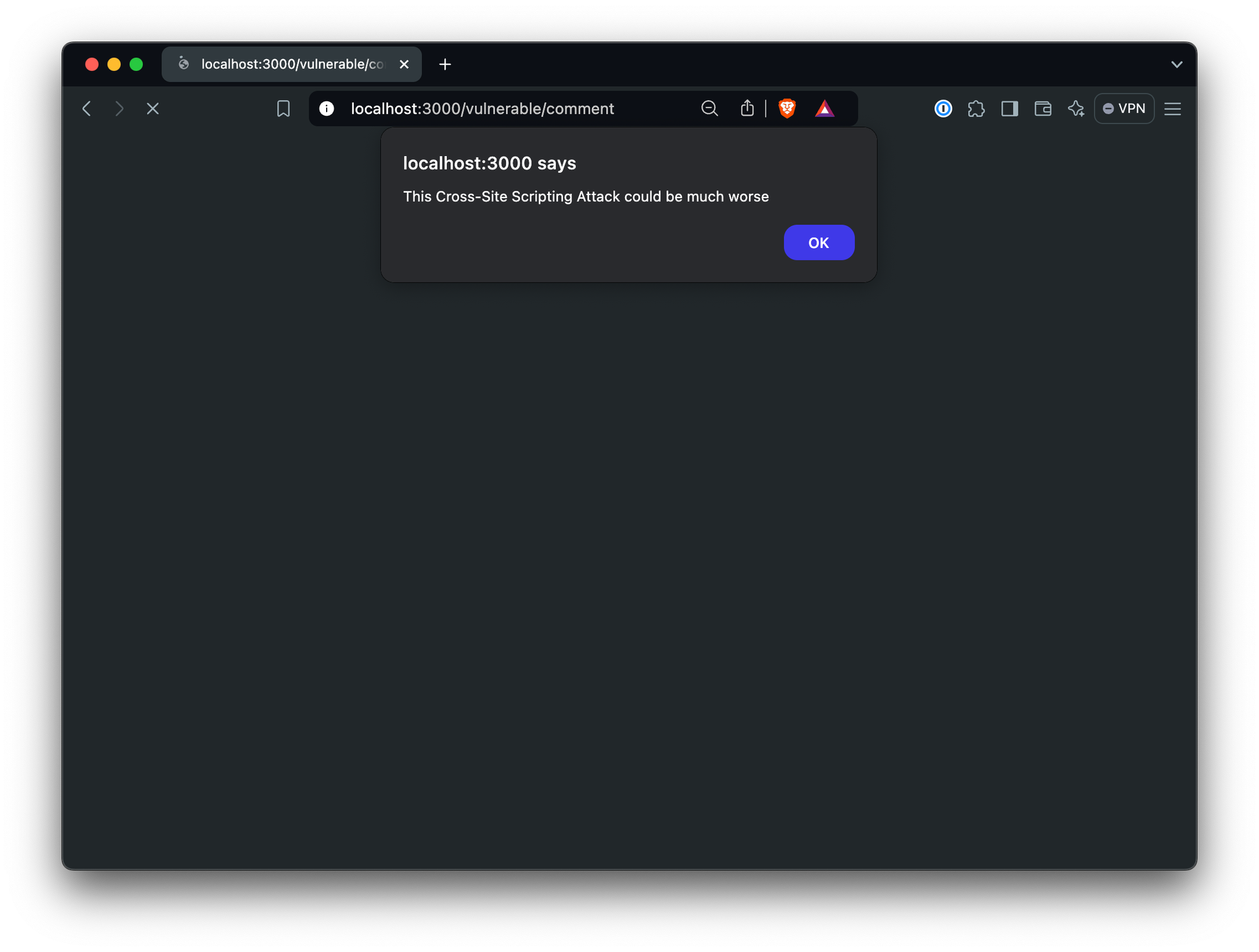 <script>alert('This Cross-Site Scripting Attack could be much worse')</script>When you submit that to the vulnerable comment endpoint, you’ll see the alert in the next page: