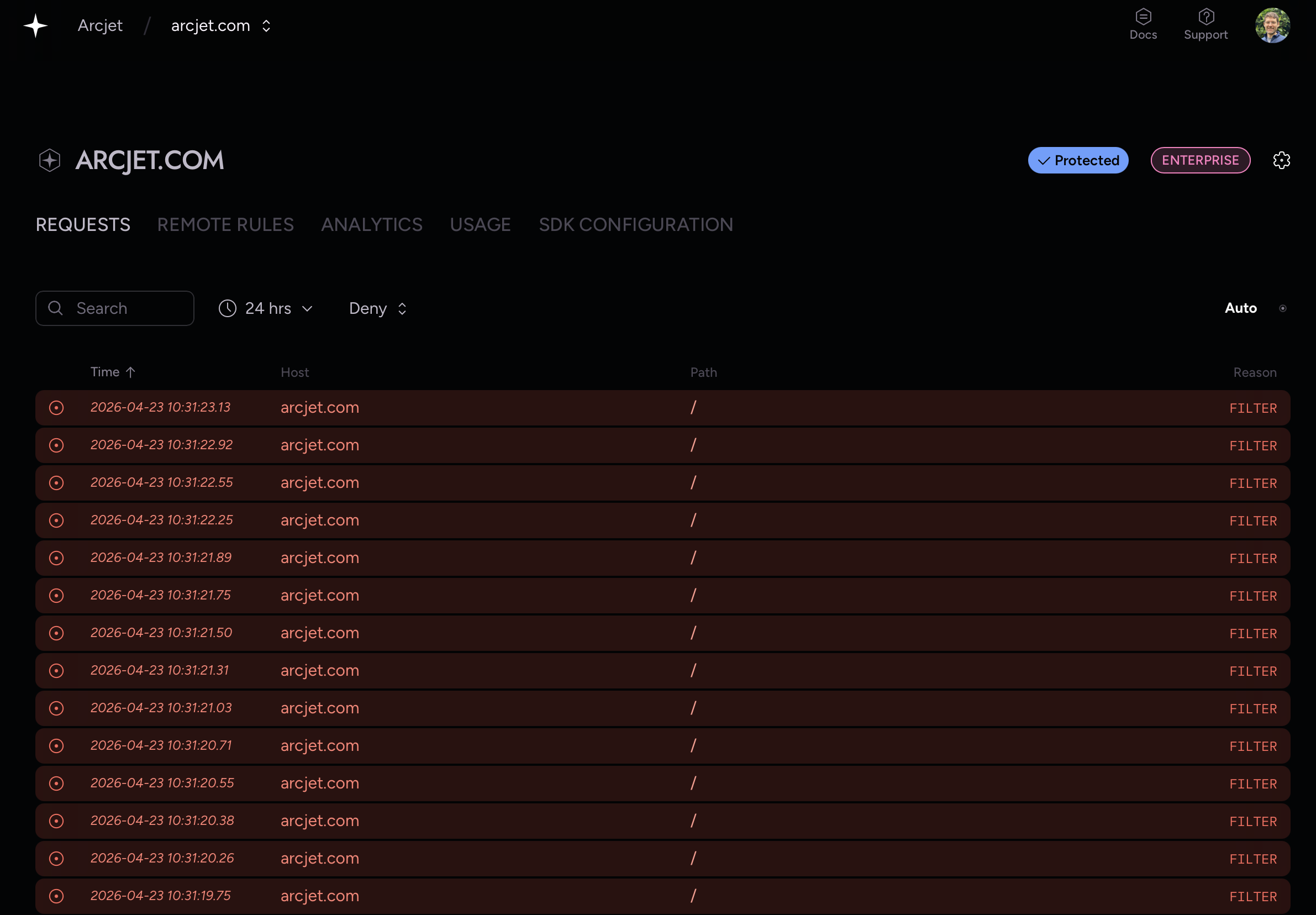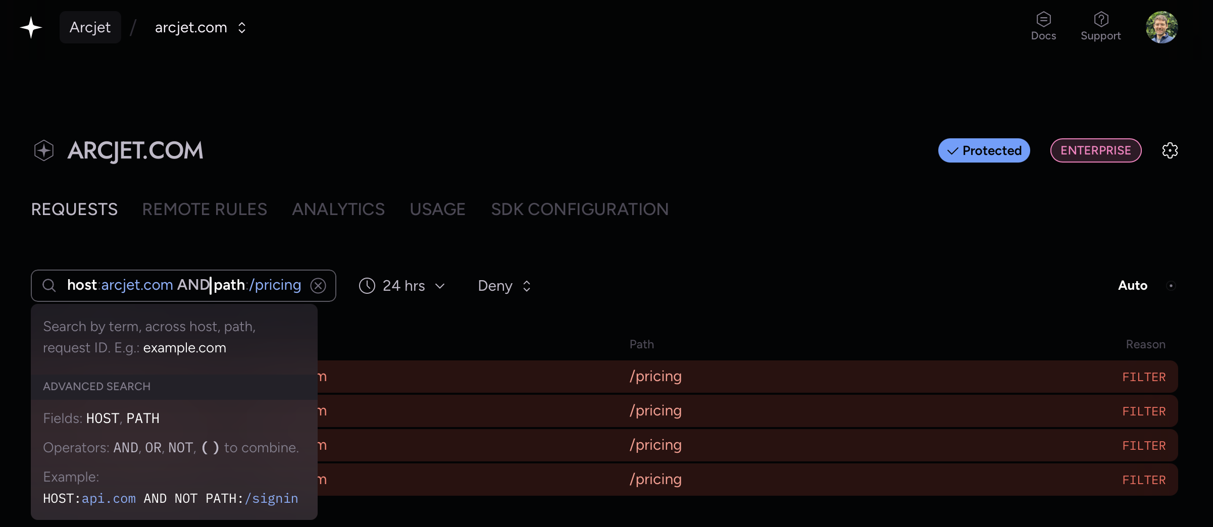 Filters are also built into the Arcjet MCP server so you can also ask your coding agent e.g. "find denied requests for my arcjet.com site yesterday".